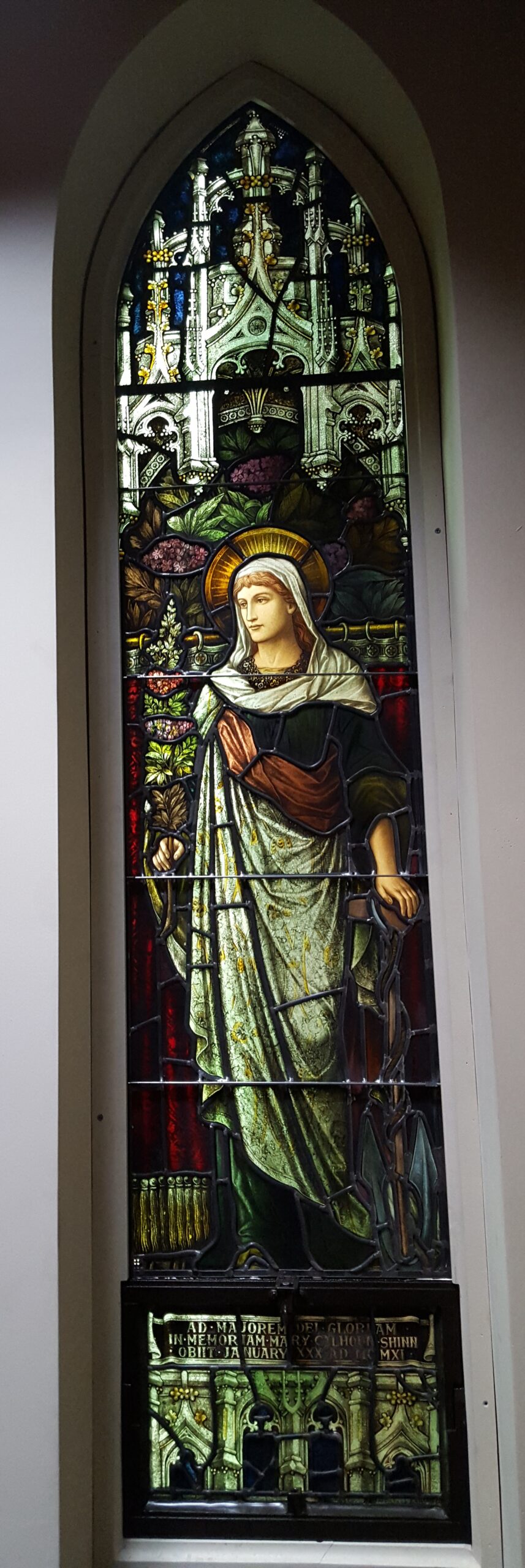 We completed the stained glass window restoration of the church’s Nave, East Wall Narthex window featuring Faith, Hope and Charity. An unknown artist created the stained glass window in 1916. The stained glass window has a medieval theme with very ornate details and rich jewel colors in the garments.